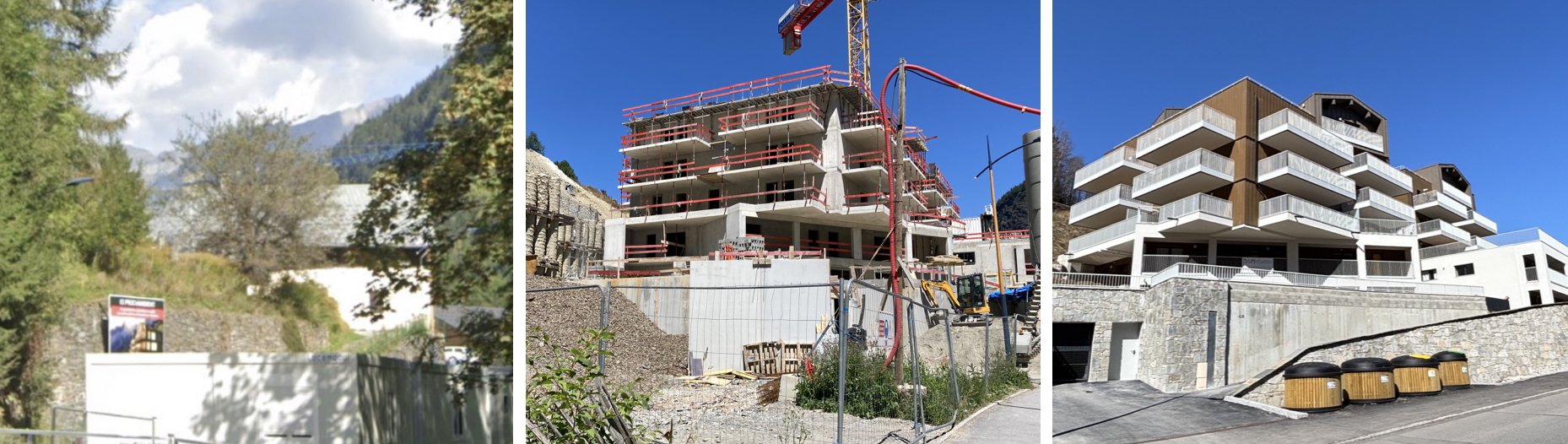 Aux Houches cet immeuble de plus de 50 appartements va plus loin en utilisant métal et matériaux composites, sur une structure 100% béton. Pas un gramme de bois en vue. Sans parler du monumental bilan carbone de l'excavation de la montagne et de la destruction d'une ancienne ferme de pays pour créer l'espace nécessaire à son implantation.