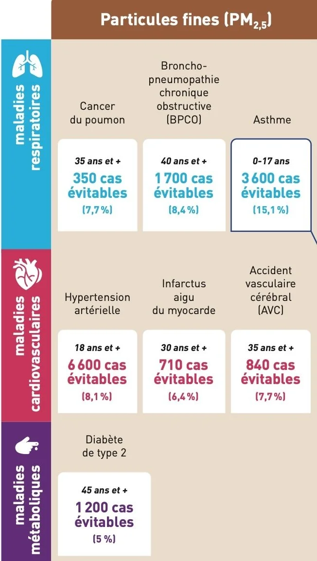 La pollution de l'air engendre des souffrances quotidiennes pour des centaines de milliers de personnes, dont de nombreux enfants. Son impact sur 8 maladies à été étudié: